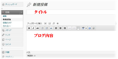 | 1)画面 上段 新規投稿 赤タイトル 表示部分に 記事のタイトルを書き込みます |