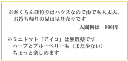 ご あ ん な い 7月はさくらんぼ狩り8月下旬からはぶどう、プルーンミニトマト等が食べる事が出来ます ※制限時間はありません。 営業時間 午前9:00〜午後5:00 パイとりんごとカスタードクリームのハーモニー おいしくって!!おかわり!! 毎日食べてもあきのこないアップルパイです 親しいお友達にプレゼントしても喜ばれますヨ。 作っているのは、アップルパイ大好きのミーちゃんです。