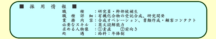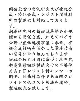 ○受託合成を中心とし、一般有機化合物の特注 合成、レジスト関連材料の青銅を行います。徹底した納期短縮・コストの低減化を図ります。